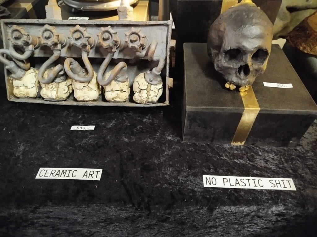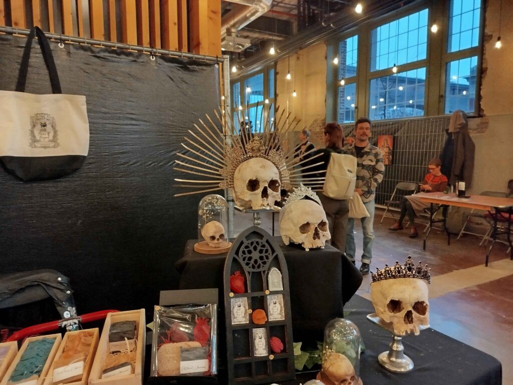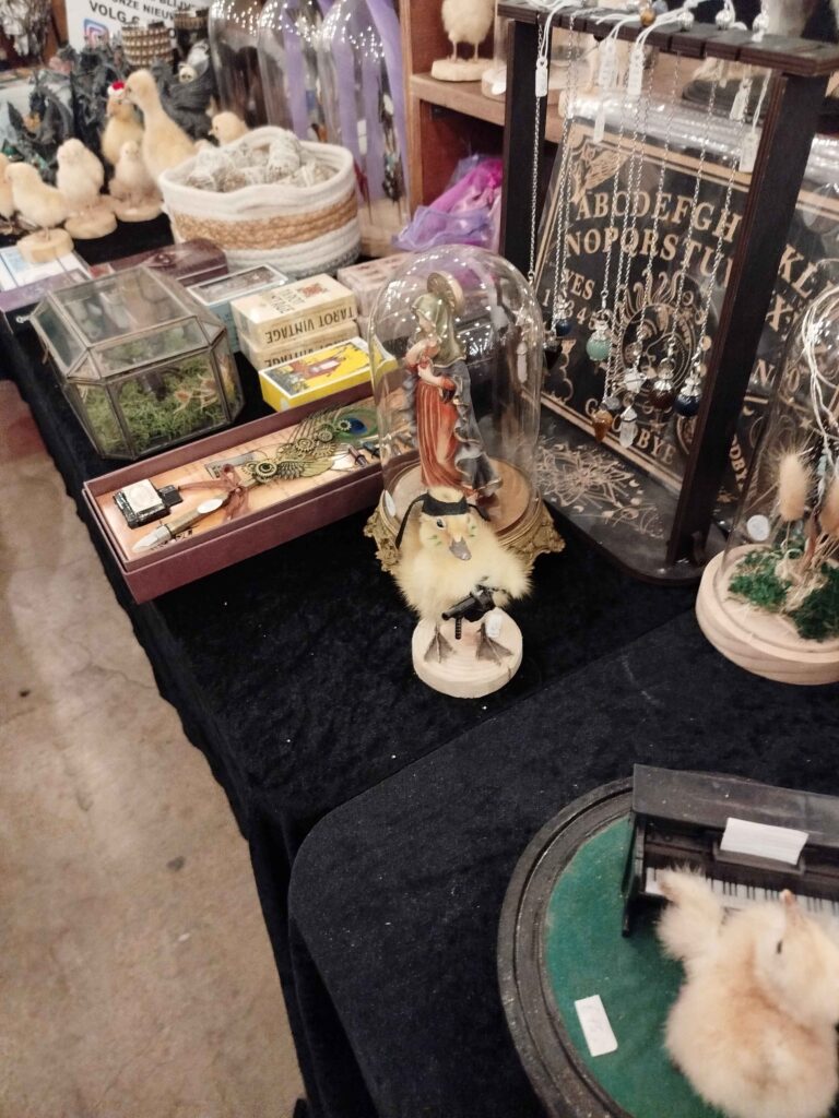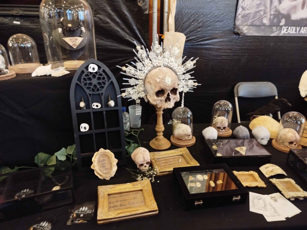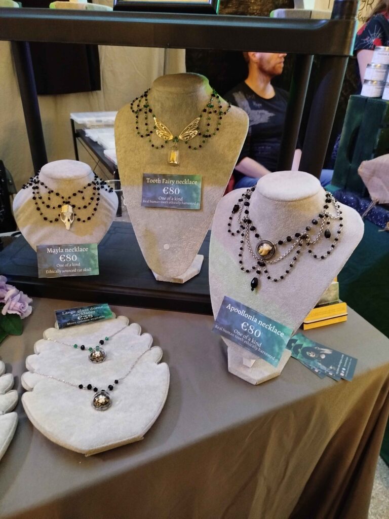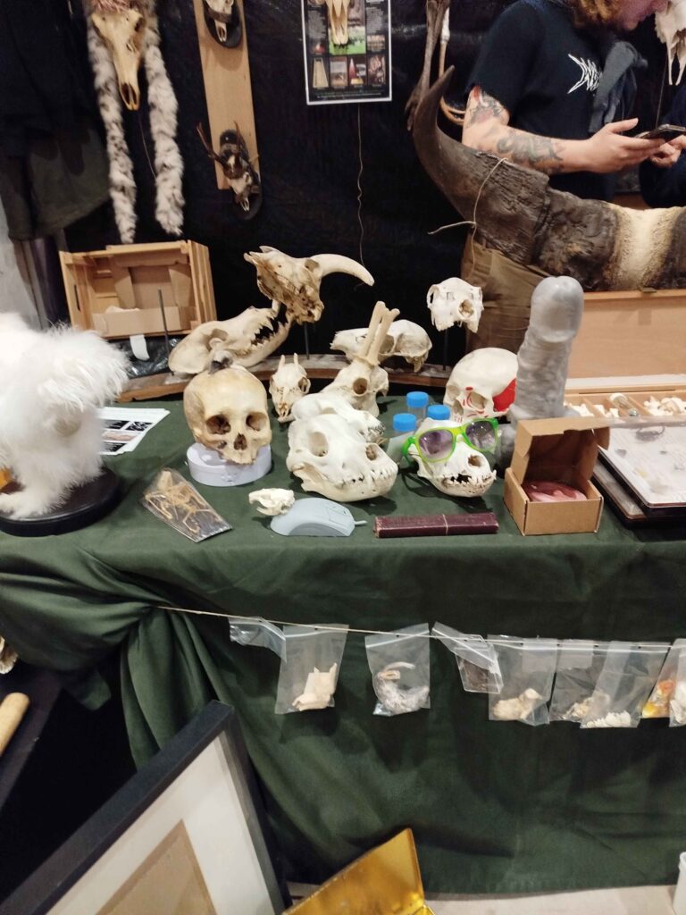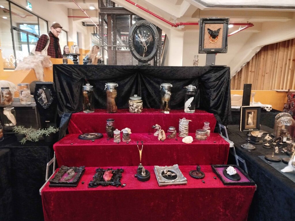 Hinter den Schließfächern ging es dann sofort los mit Ständen, die schlussendlich dicht an dicht über 4 Etagen verteilt waren. Es vermischten sich Schmuck-, Handwerks-, und Präparatstände mit Ausstellungen von Bildern und Kunstwerken. Schädel, Knochen, und Kunstwerke aus denselben gab es fast überall zu sehen. Mit (innerlich) offenem Mund schlenderten wir über den ersten Teil des Marktes.