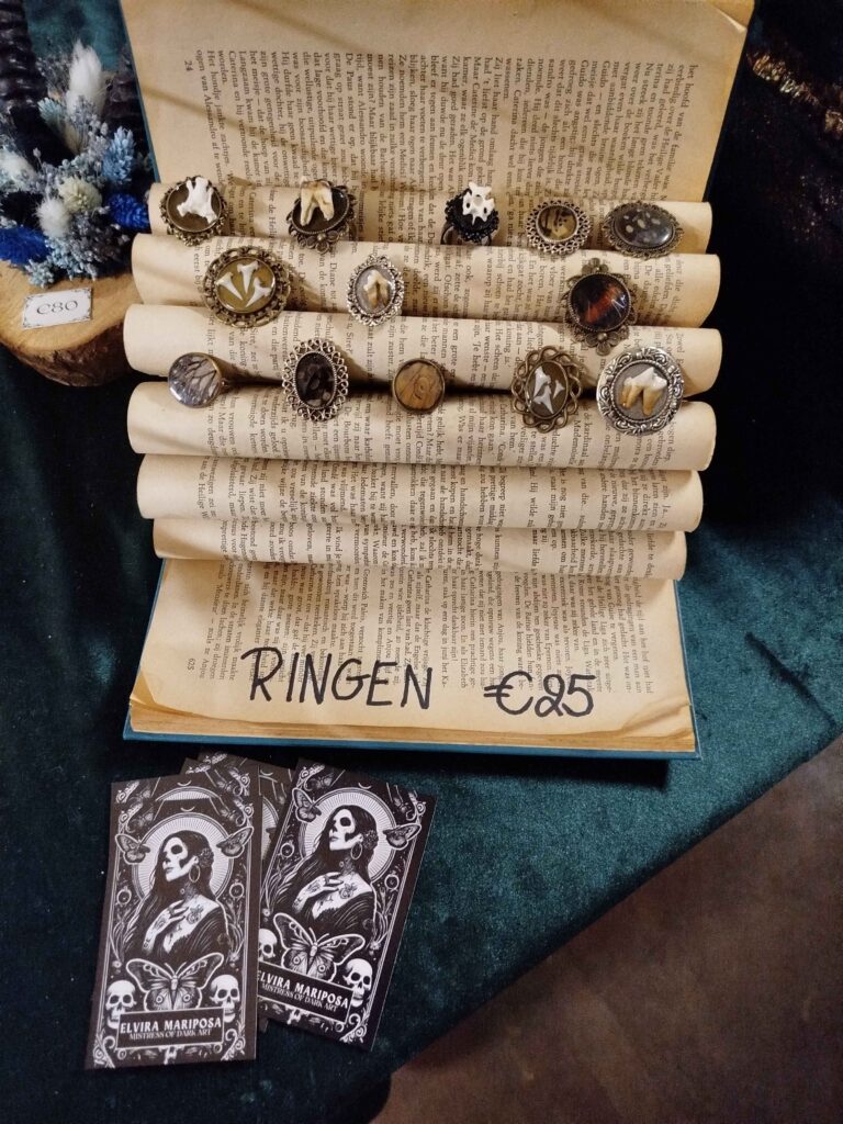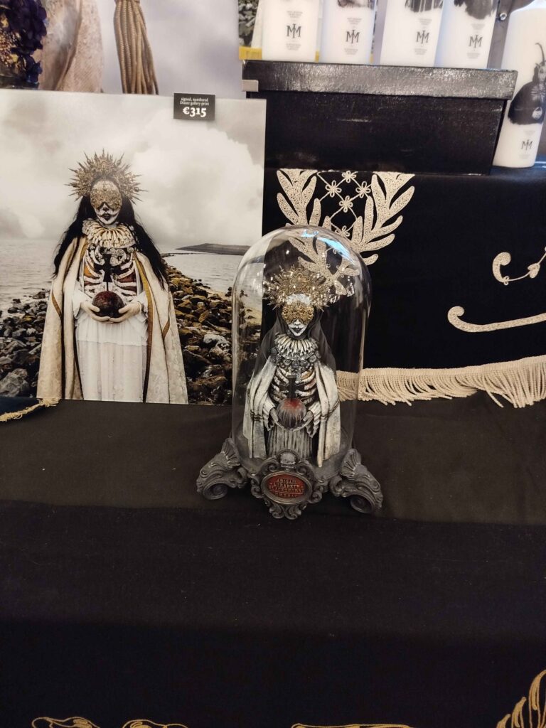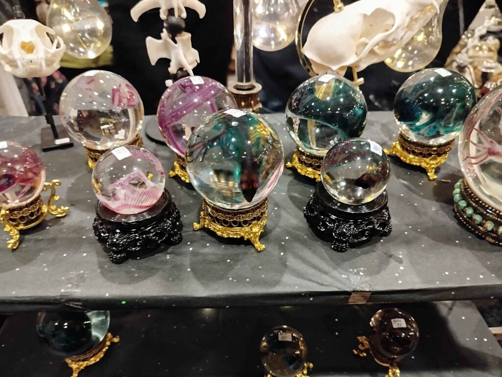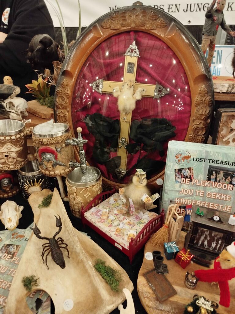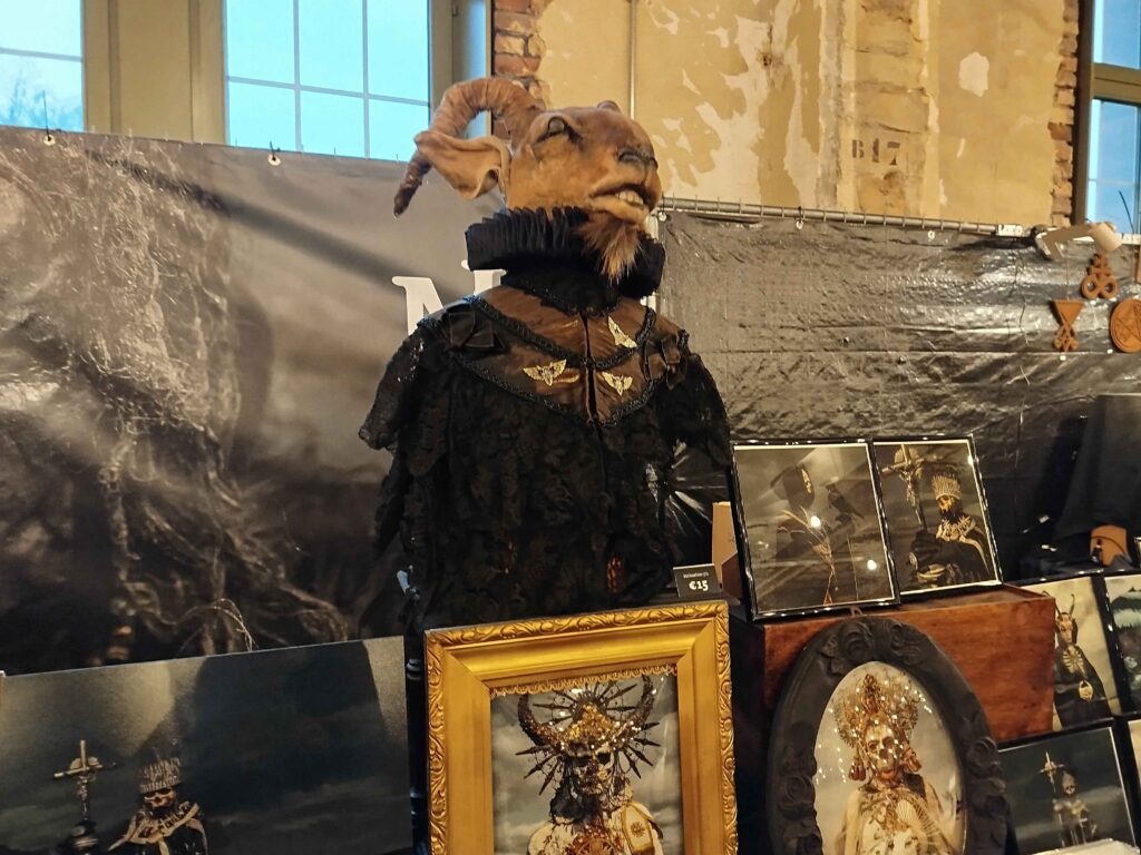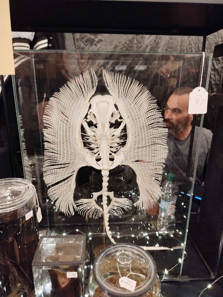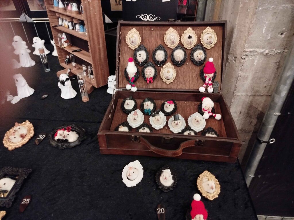 Hinter den Schließfächern ging es dann sofort los mit Ständen, die schlussendlich dicht an dicht über 4 Etagen verteilt waren. Es vermischten sich Schmuck-, Handwerks-, und Präparatstände mit Ausstellungen von Bildern und Kunstwerken. Schädel, Knochen, und Kunstwerke aus denselben gab es fast überall zu sehen. Mit (innerlich) offenem Mund schlenderten wir über den ersten Teil des Marktes.