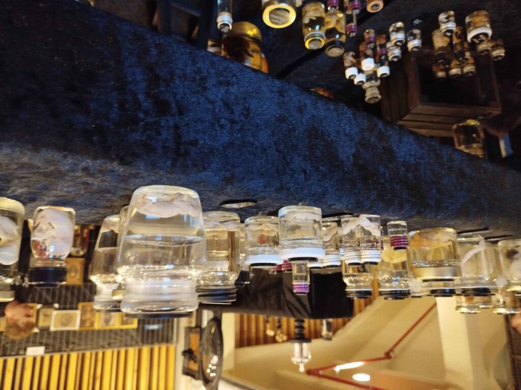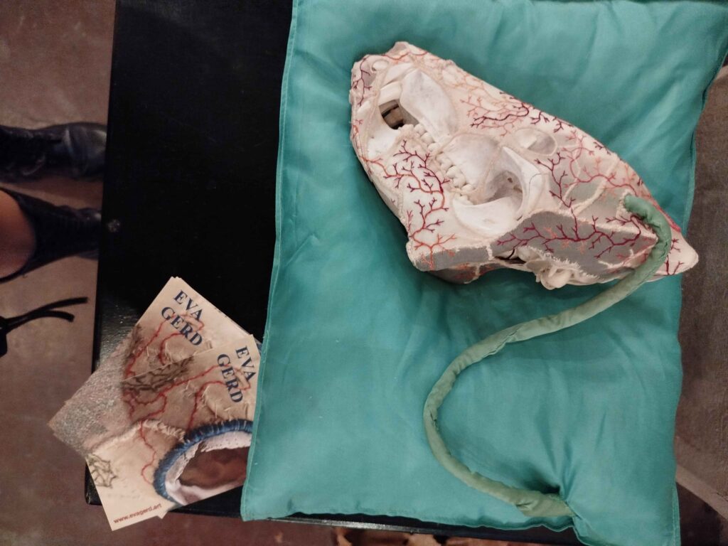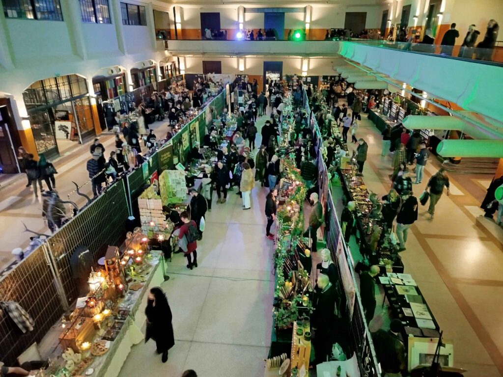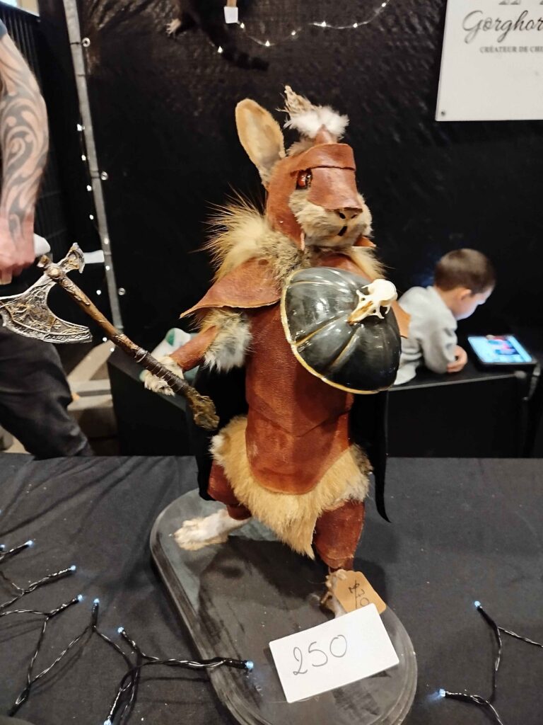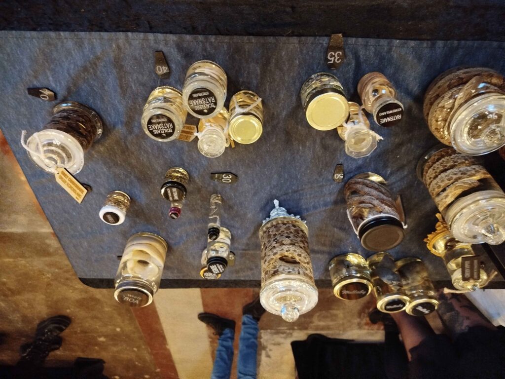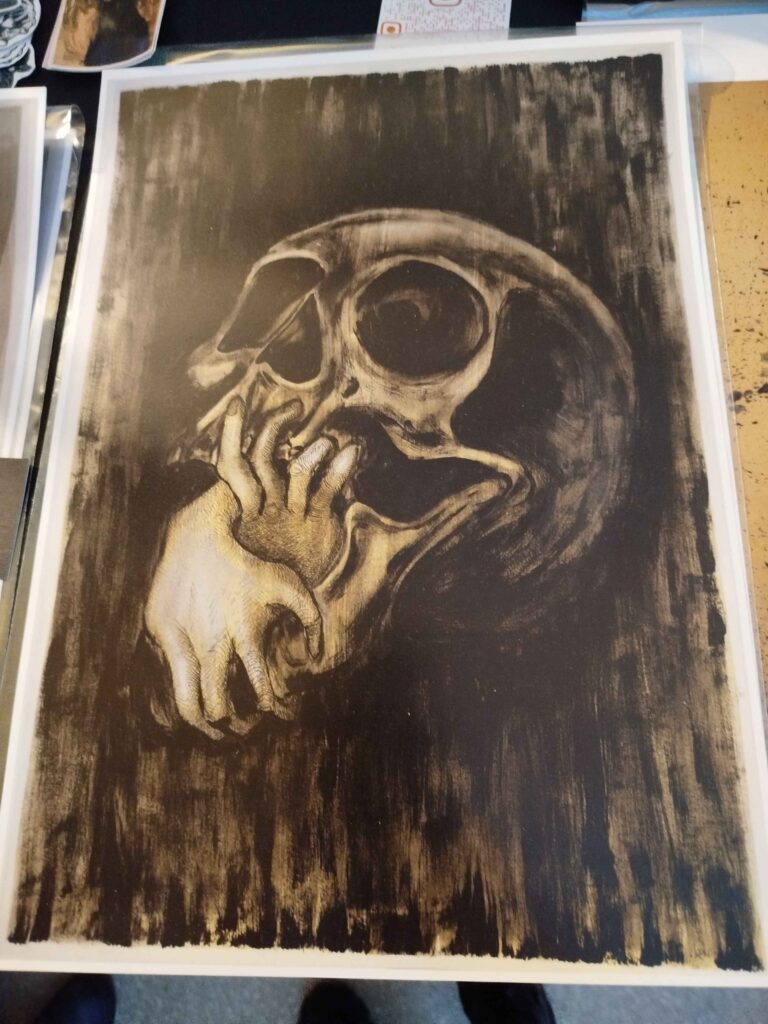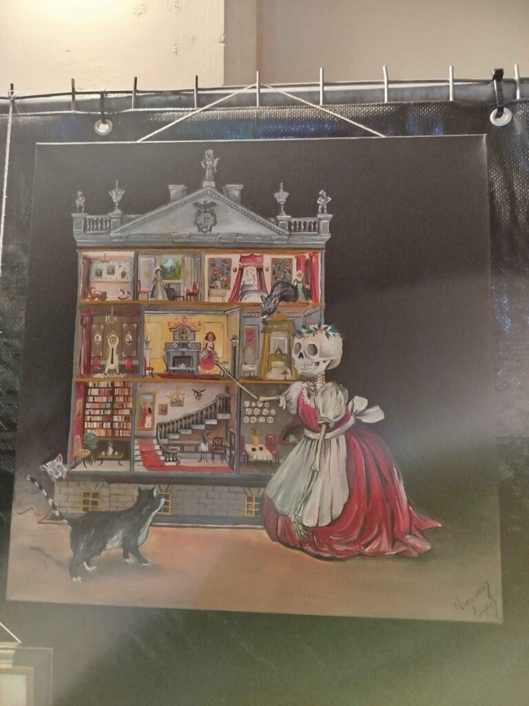 Hinter den Schließfächern ging es dann sofort los mit Ständen, die schlussendlich dicht an dicht über 4 Etagen verteilt waren. Es vermischten sich Schmuck-, Handwerks-, und Präparatstände mit Ausstellungen von Bildern und Kunstwerken. Schädel, Knochen, und Kunstwerke aus denselben gab es fast überall zu sehen. Mit (innerlich) offenem Mund schlenderten wir über den ersten Teil des Marktes.
